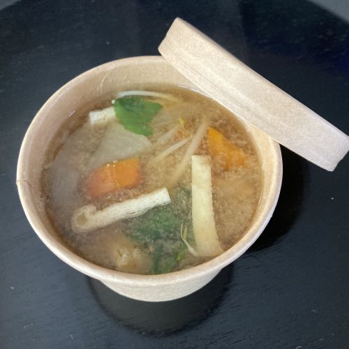 大根や人参などの根菜と、油揚げ・青菜など具だくさんの味噌汁です。