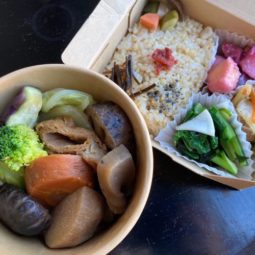 ・ご注文を受けてからご用意いたします。 ・割り箸は一膳10円、お弁当用のレジ袋は1枚5円です。ゴミ削減にご協力ください。 ・肉・魚・卵・乳製品は不使用、原材料に小麦・大豆・ごまを含みます。 ・お弁当のお引渡し時間は、昼は11:45から、夜は17:15から営業時間内で承ります。